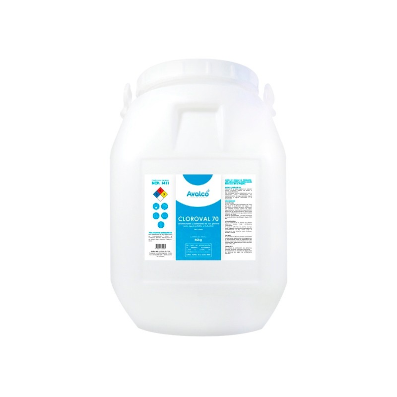 El hipoclorito de calcio al 70% es un desinfectante y sanitizante de alta eficacia, capaz de eliminar bacterias, algas, hongos y otros microorganismos sensibles a la acción del cloro ?. El Cloroval-70 es un producto sólido, seco, de fácil manipulación, de color blanco y forma granular, con un contenido mínimo de 65% de cloro disponible.