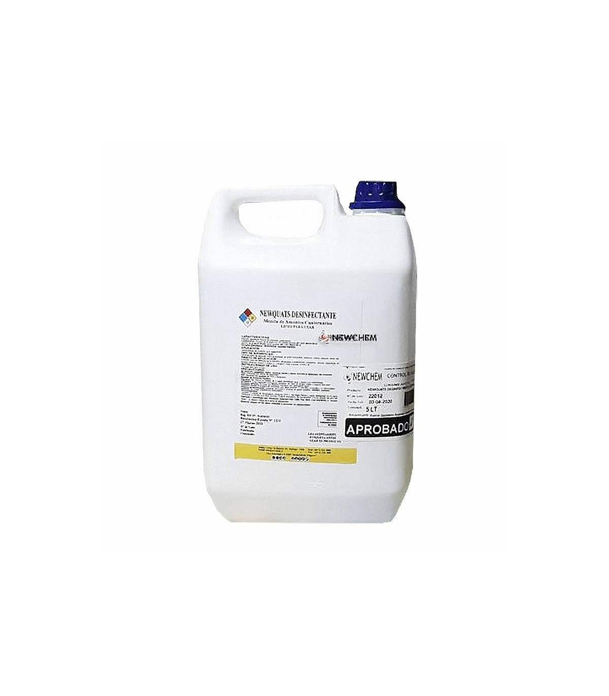 Newquats Desinfectante - Amonio Cuaternario 5lts con Registro ISP. Su amplio espectro de actividad antimicrobiana, abarca virus bacterias, hongos, algas. Incluidos el CORONAVIRUS - COVID 19. Los principios activos del Amonio Cuaternario, permite la desinfección total del área o espacio tratado.