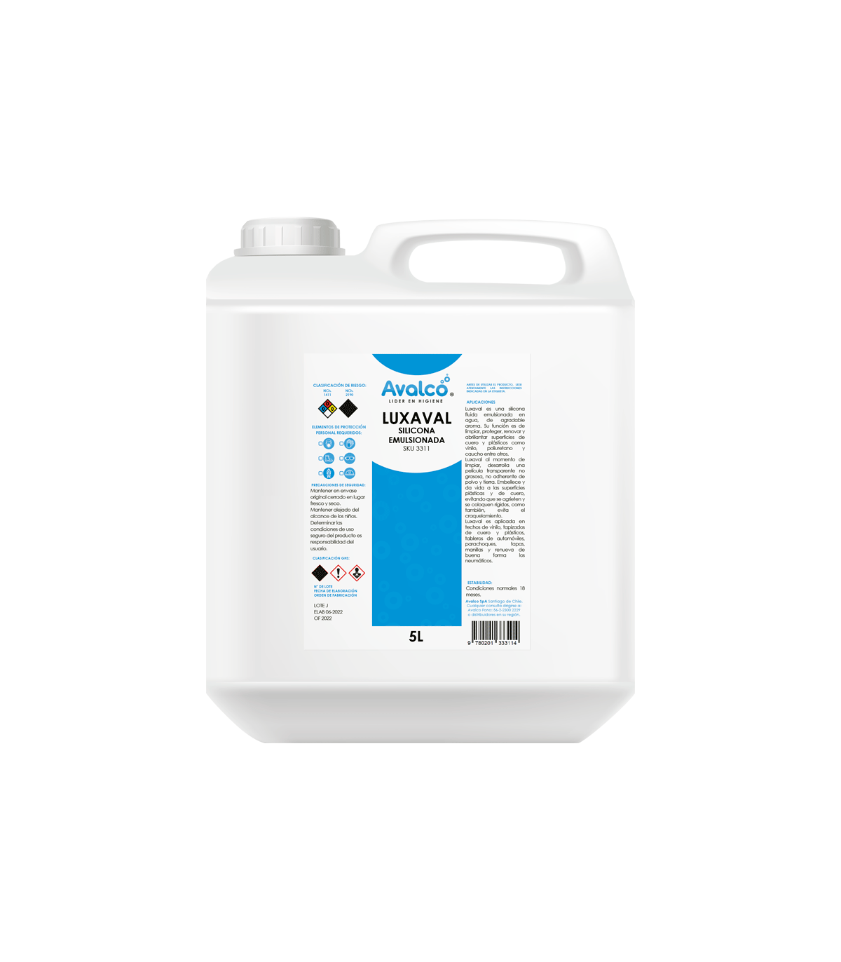 Luxaval - Silicona Bd 5 Kg, es una silicona fluida emulsionada en agua, de agradable aroma. Su función es de limpiar, proteger, renovar y abrillantar superficies de cuero y plásticos como vinilo, poliuretano y caucho entre otros. Luxaval al momento de limpiar, desarrolla una película transparente no grasosa, no adherente de polvo y tierra. Embellece y da vida a las superficies plásticas y de cuero, evitando que se agrieten y se coloquen rígidos, como también, evita el craquelamiento. Luxaval es aplicada en techos de vinilo, tapizados de cuero y plásticos, tableros de automóviles, parachoques, tapas, manillas y renueva de buena forma los neumáticos. Aprovecha de comprar detergentes automotriz en nuestra tienda.
