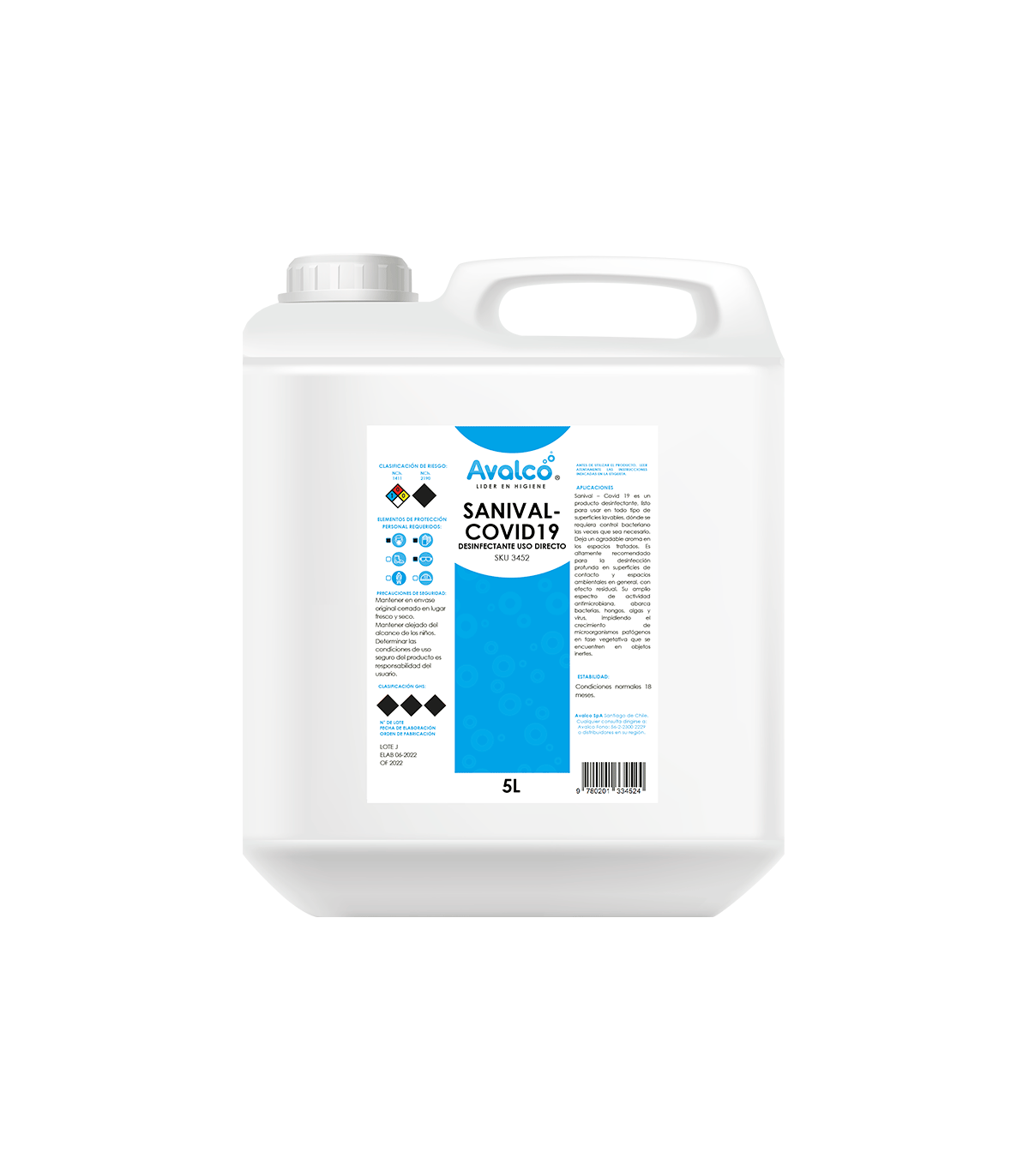 Sanival – Covid 19 es apropiado para la desinfección en casas, hospitales, clínicas, instituciones educativas, oficinas y automoviles. Es un excelente sanitizante que actúa en la limpieza profunda de equipos, estanques, cubiertas, cocinas y baños, así como cualquier superficie del hogar, de acero inoxidable, plástico, vidrio y pisos. Sanival – Covid 19 está formulado para su uso puro, aplicar con escobilla, pulverizador, trapero, etc.