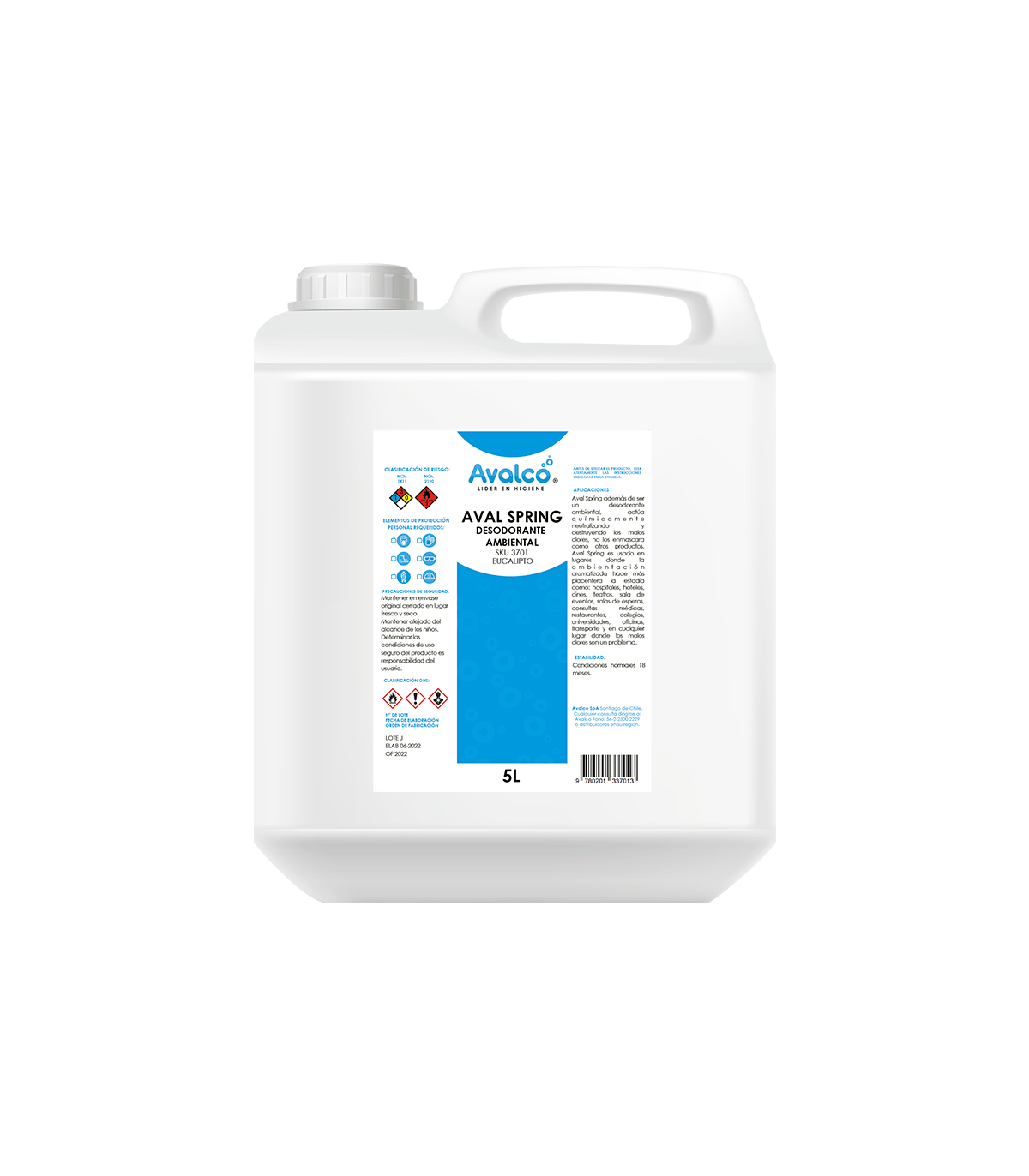 Aval Spring - Desodorante Ambiental aroma Eucalipto Bd 5 Litros, es una elaboración ambiental especialmente diseñada por expertos perfumistas, que han seleccionados cuidadosamente los ingredientes para eliminar rápida y efectivamente el mal olor, proveniente de materia orgánica como: alimentos, frituras, excretas, humos, etc.