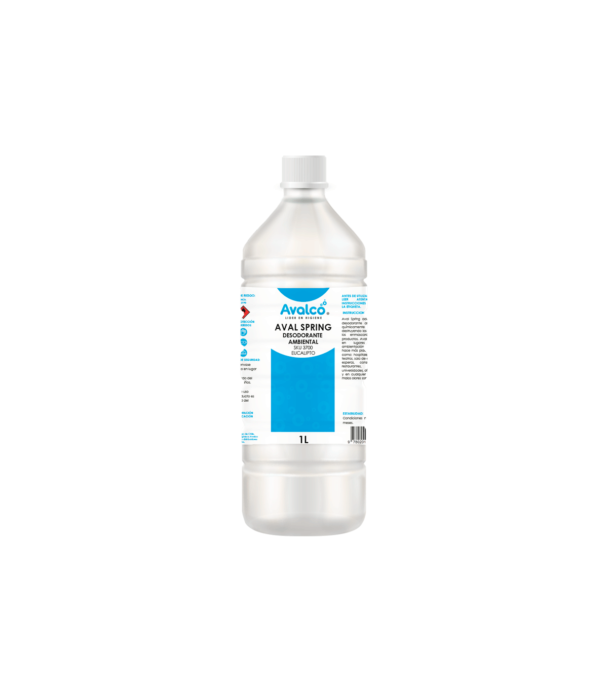 Aval Spring - Desodorante Ambiental aroma Eucalipto Bd 1 L, es una elaboración ambiental especialmente diseñada por expertos perfumistas, que han seleccionados cuidadosamente los ingredientes para eliminar rápida y efectivamente el mal olor, proveniente de materia orgánica como: alimentos, frituras, excretas, humos, etc.
