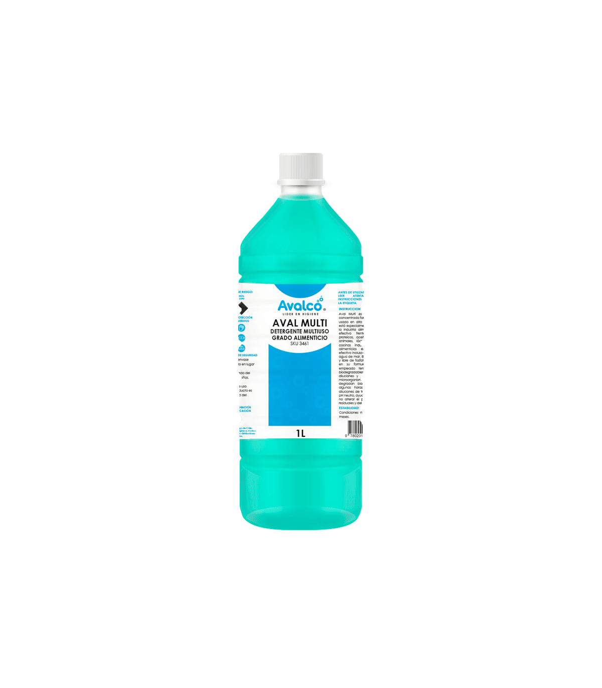 Aval Multi - Detergente Multiuso Grado Alimenticio 1 Litro es un detergente concentrado formulado para ser usado en alta dilución. Su uso está especialmente orientado a la industria alimenticia, por ser efectivo frente a residuos proteicos, aceites vegetales, animales y lácteos, además de limpieza de mataderos, cocinas industriales y áreas alimenticias en general. Es efectivo incluso al ser diluido con agua de mar, biodegradable y libre de fosfatos, esto nos indica que en su formulación se han empleado tensoactivos 100% biodegradables que a grandes diluciones y en presencia de microorganismos, éstos se degradan biológicamente en algunas horas.