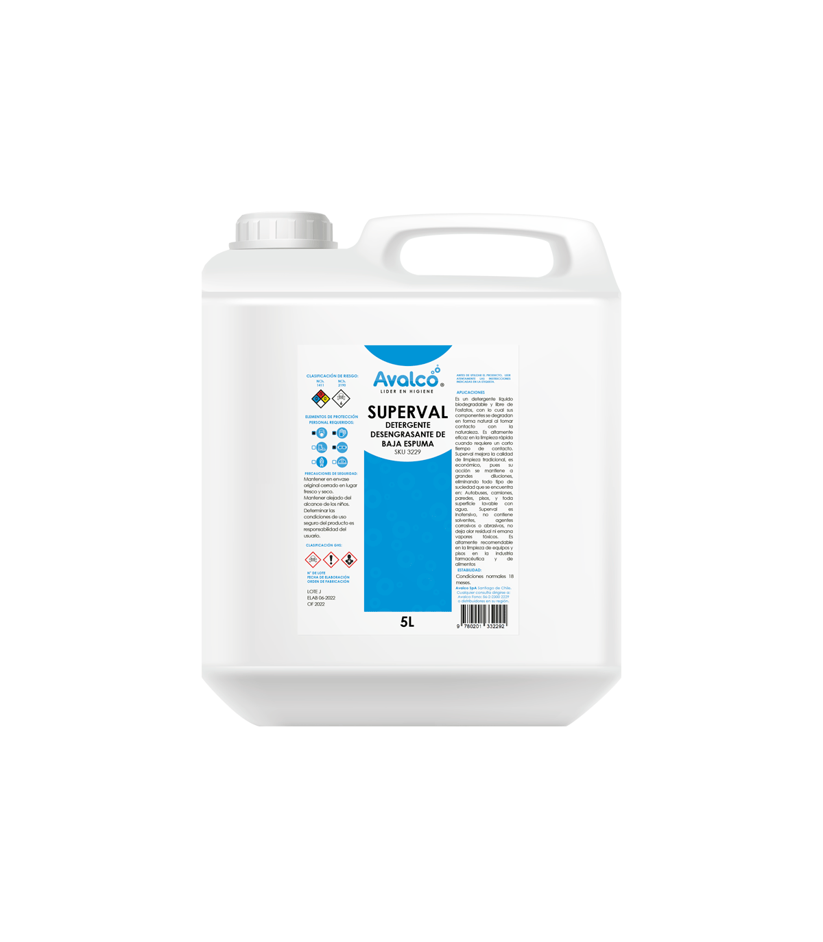 Superval - Detergente Desengrasante De Baja Espuma Bd 5 Litros. Es un detergente desengrasante líquido biodegradable y libre de Fosfatos, con lo cual sus componentes se degradan en forma natural al tomar contacto con la naturaleza. Es altamente eficaz en la limpieza rápida cuando requiere un corto tiempo de contacto. Superval mejora la calidad de limpieza tradicional, es económico, pues su acción se mantiene a grandes diluciones, eliminando todo tipo de suciedad que se encuentra en: Autobuses, camiones, paredes, pisos, y toda superficie lavable con agua. Superval es inofensivo, no contiene solventes, agentes corrosivos o abrasivos, no deja olor residual ni emana vapores tóxicos. Es altamente recomendable en la limpieza de equipos y pisos en la industria farmacéutica y de alimentos
