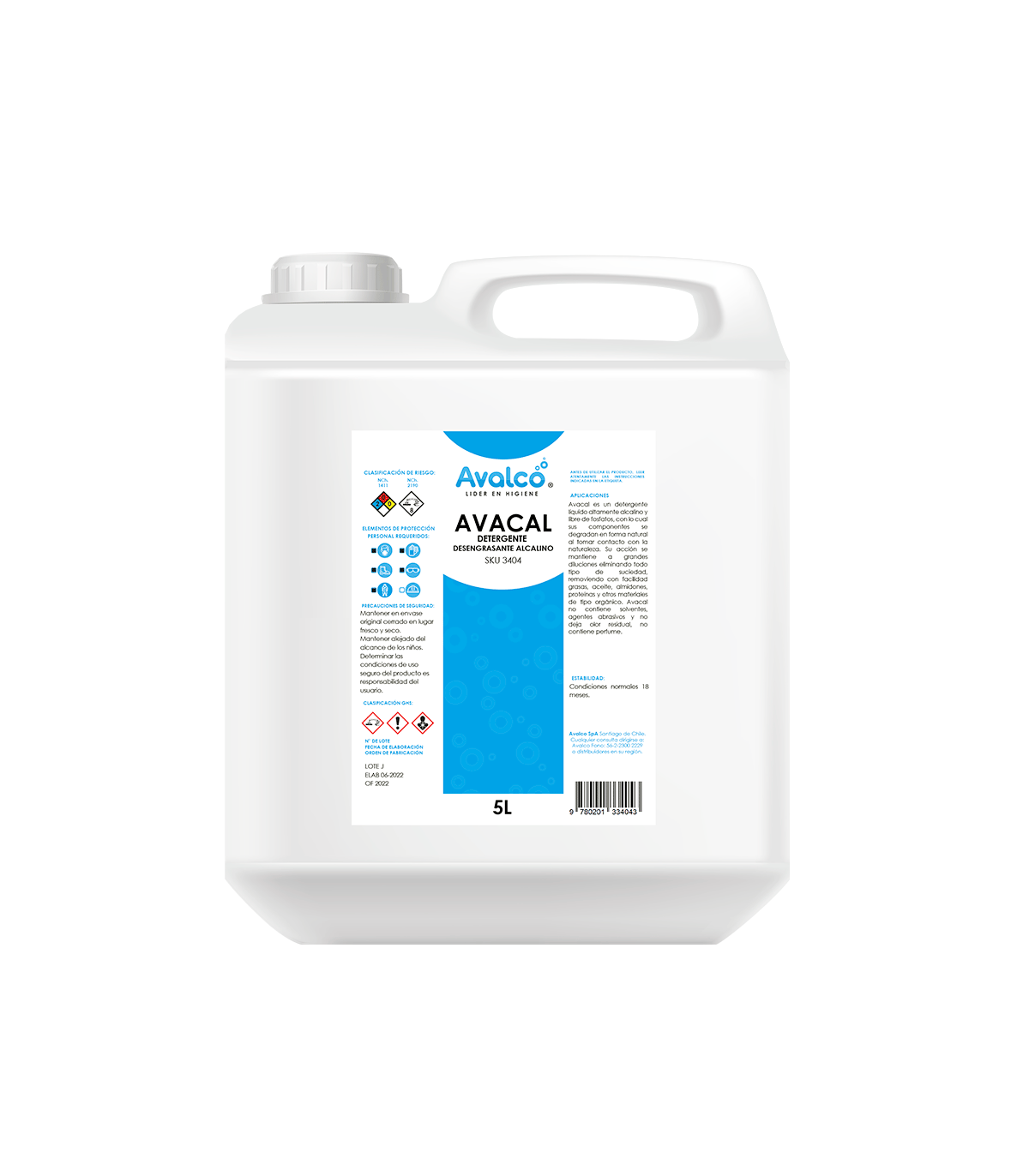 Avacal - Detergente Desengrasante Alcalino Sin Espuma Bd 5 Litros, es un detergente líquido altamente alcalino y libre de fosfatos, con lo cual sus componentes se degradan en forma natural al tomar contacto con la naturaleza.