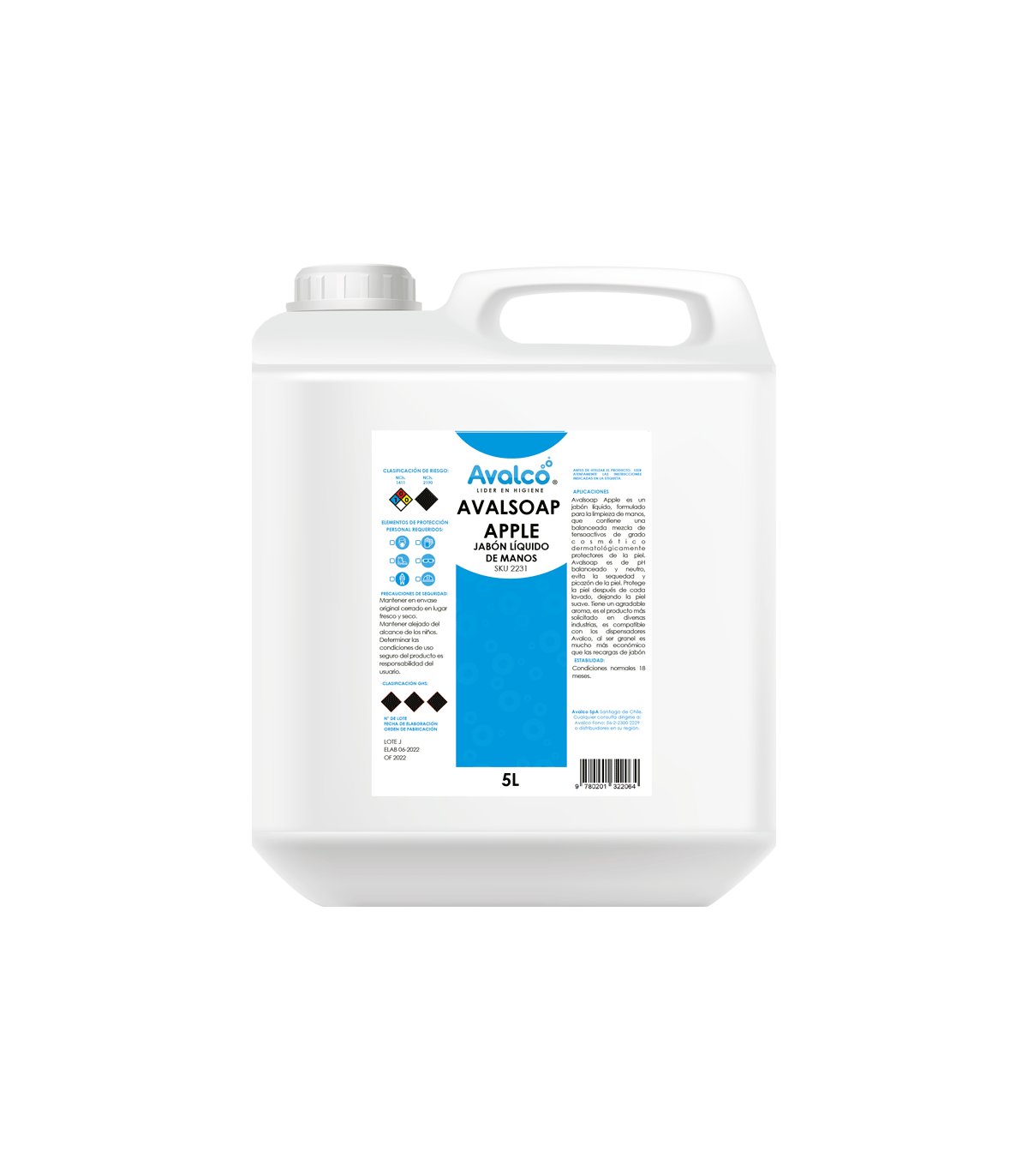 Avalsoap Apple - Jabón Líquido 5L, es un efectivo jabón. Tiene un agradable aroma a manzana, es el producto más solicitado en diversas industrias compatible con los dispensadores de jabón, al ser granel es mucho más económico que las recargas de jabón en bolsas. Aprovecha de comprar jabones a precios especiales.