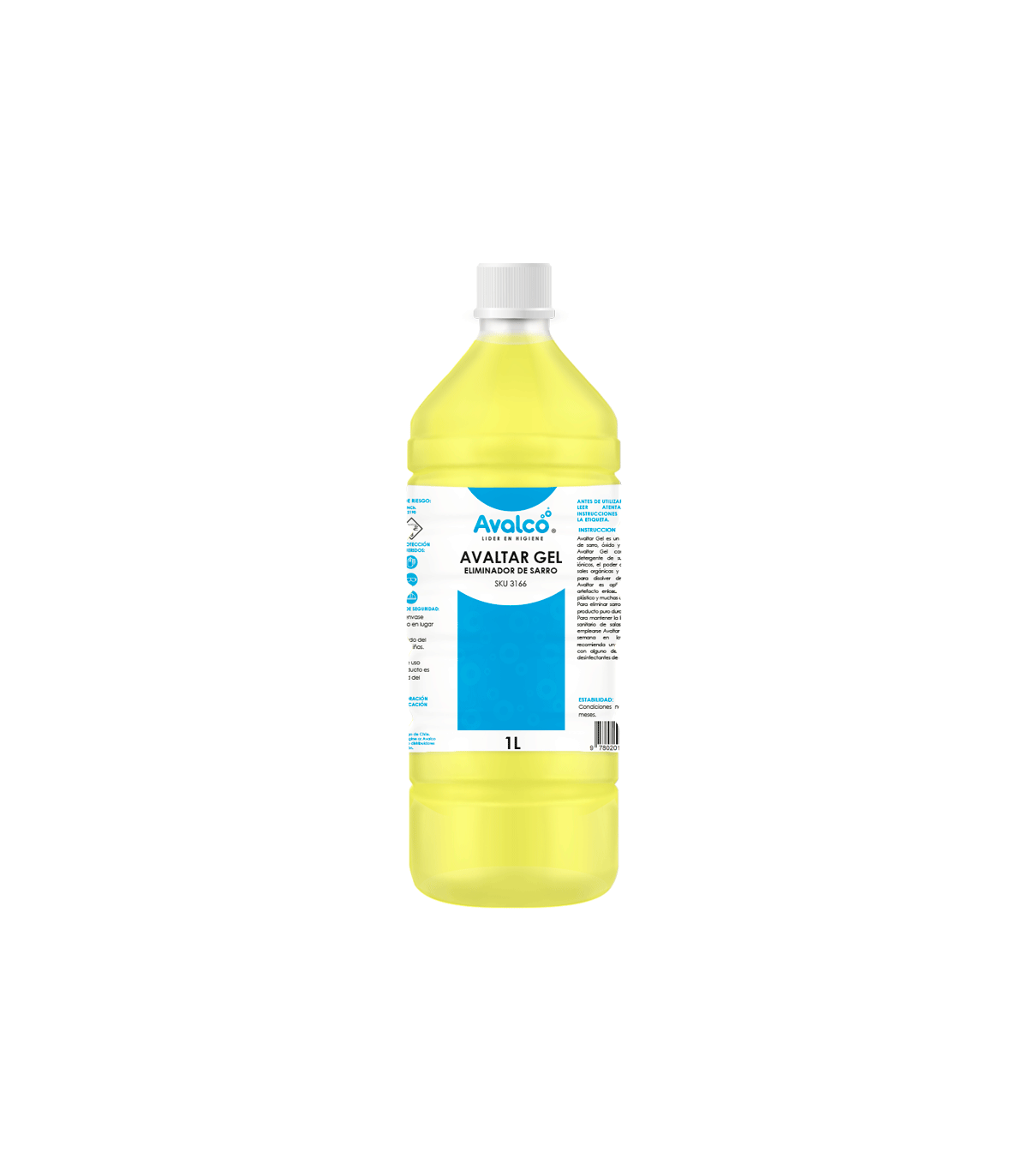 Avaltar Gel - Eliminador De Sarro 1 L, es un poderoso limpiador de sarro, óxido y manchas de orín. Avaltar Gel combina el efecto detergente de sus tensoactivos no iónicos, el poder complejante de sus sales orgánicas y el ambiente ácido para disolver depósitos calcáreos. Gracias a su composición en gel permite aplicarlo en superficies verticales para que se mantenga más tiempo en contacto. Avaltar Gel es aplicable a cualquier artefacto enlozado, azulejo, mármol, plástico y muchas otras superficies. Aprovecha de comprar limpiadores multiusos baratos.