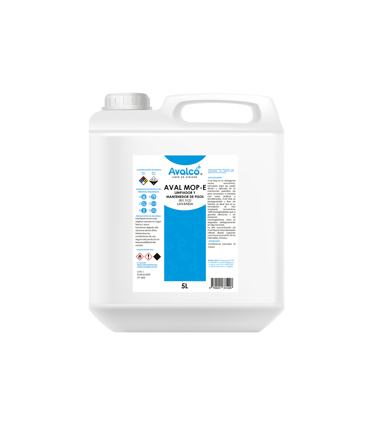 Aval Mop E- Lavanda 5 Litros es un tipo de producto químico especializado como mantenedor de pisos económicos neutro, formulado para ser usado diluido, y aplicado en la mantención periódica de pisos encerados o lustrados con ceras acrílicas o emulsionadas. Aval Mop es biodegradable y libre de fosfatos, es decir que en su formulación se han empleado tensoactivos 100% biodegradables que a grandes diluciones y en presencia de microorganismos, éstos se degradan biológicamente en algunas horas.